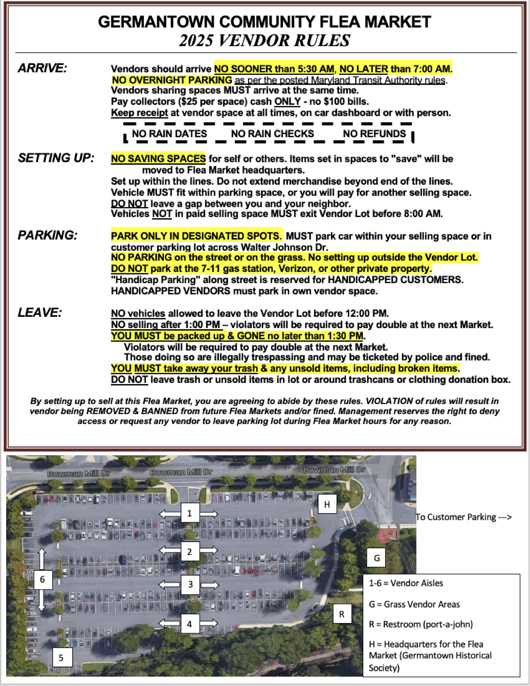 By setting up to sell at this Flea Market, you are agreeing to abide by these rules. VIOLATION of rules will result in vendor being REMOVED & BANNED from future Flea Markets. Management reserves the right to deny access or request of any vendor to leave parking lot during Flea Market Hours.